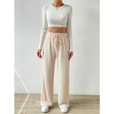 Knot Waist Textured Knit Wide Leg Pants Elastic High Waist Solid Color Casual Loose Straight Women's Clothing
