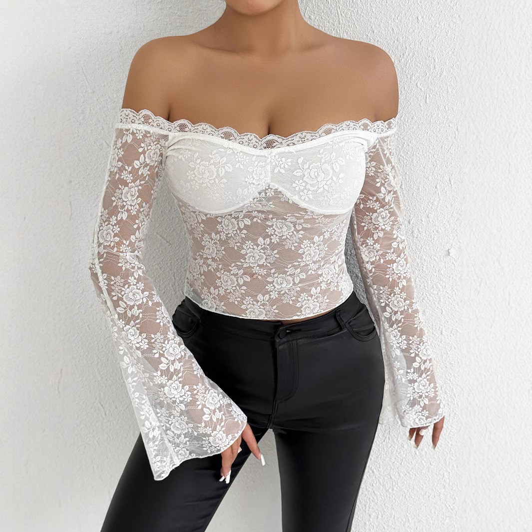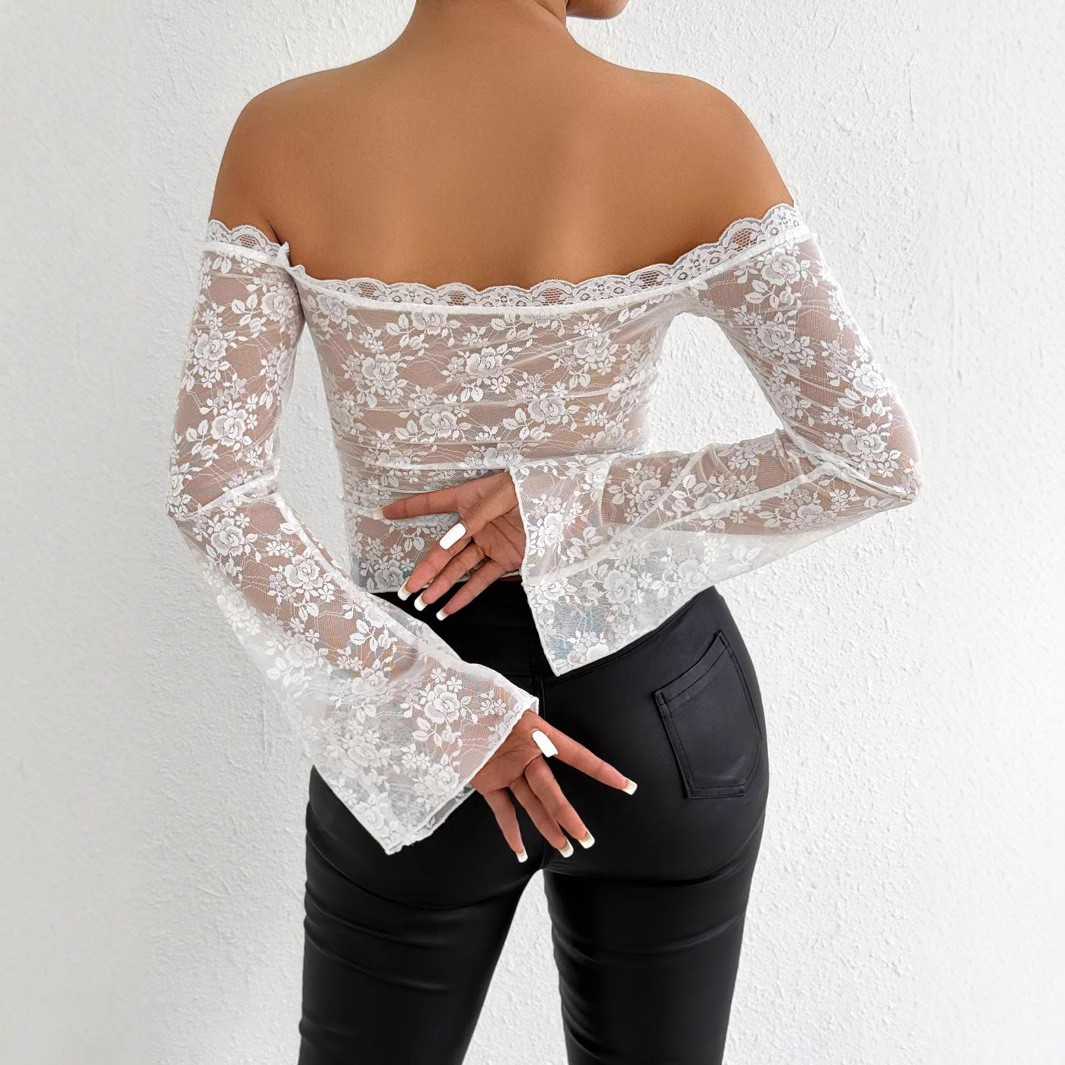 Sexy Off-shoulder Tops Ladies T-shirts Lace Bottom Raglan Sleeve Tops