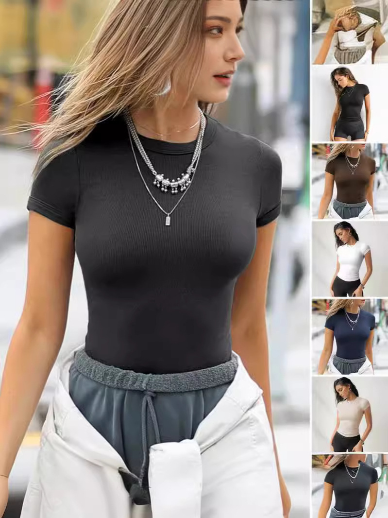 Women's European and American Threaded Slim Fit Hottie Top Solid Color Sports Short Sleeve T-Shirt